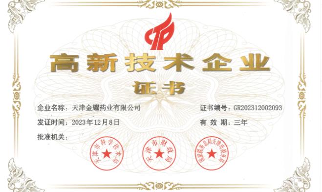 金耀药业通过国家高新技术企业复审认定